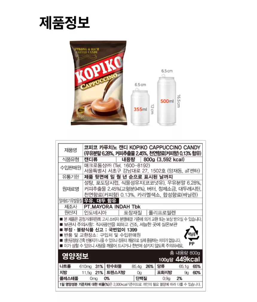 마요라 코피코 KOPIKO 커피맛 카푸치노맛 커피 캔디 대용량 800g